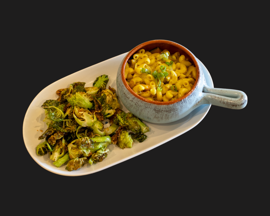 Our plant-based pumpkin Mac N Cheese. Served with hash.