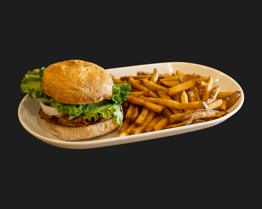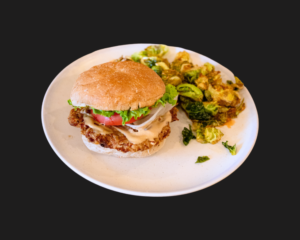 Kaiser bun, veggie patty, lettuce, tomato, onion, mystery sauce, vegan cheese and spicy bomb sauce.