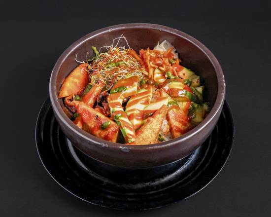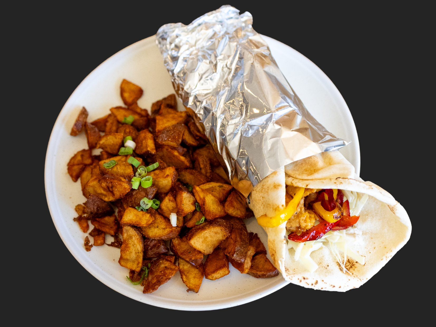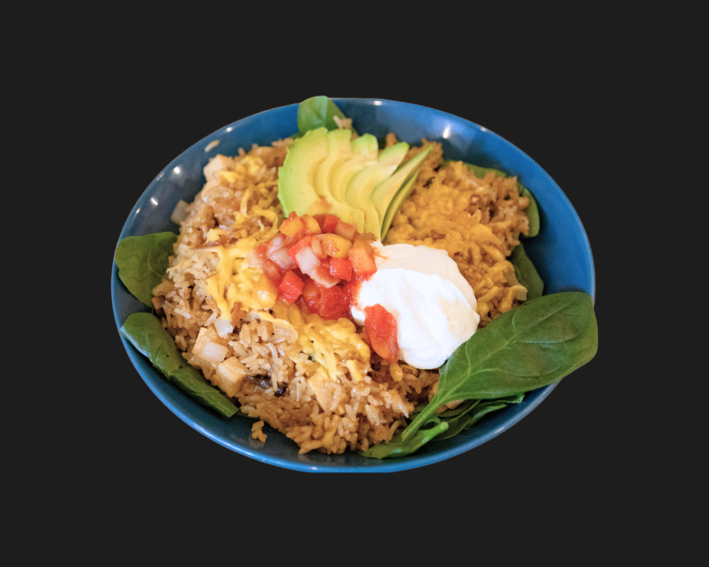 Pan-fried tofu, rice, mushrooms, spinach, gouda, sautéed in our secret teriyaki sauce. Topped with avocado, sriracha, salsa, and sour cream.