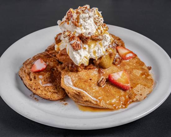 3 cinnamon pancakes, brown sugar and apple compote, icing and caramel drizzle. Garnished with candied nuts and a scoop of coconut whipped cream and seasonal berries.