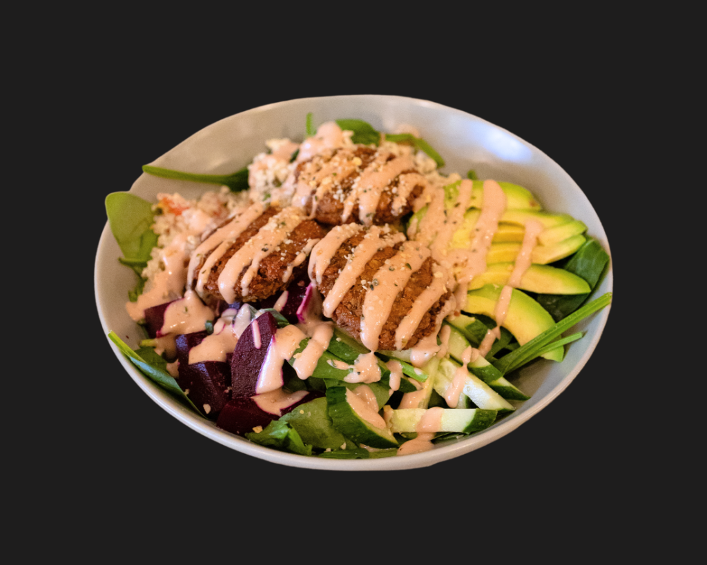 Lentil falafel, vegan feta, quinoa tabbouleh, pickled beet, shredded carrot, avocado and cucumber with sundried tomato hummus, lemon garlic tahini dressing. Garnished with hemp hearts and chia seeds.