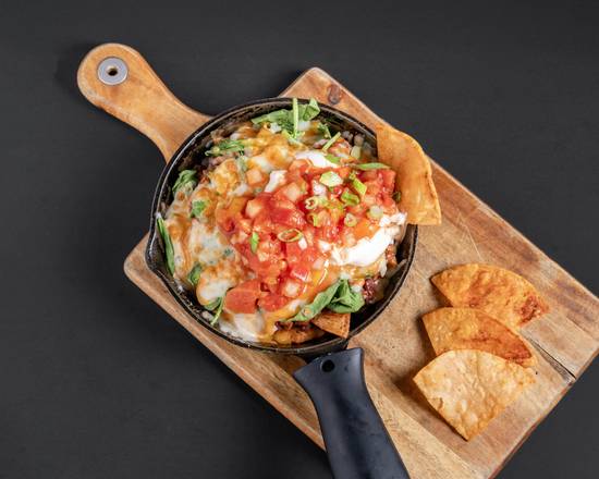 Fried egg or tofu, Mosaics fajita beans and peppers, hash browns, spinach and cheddar cheese. Salsa, sour cream and house made corn chips.