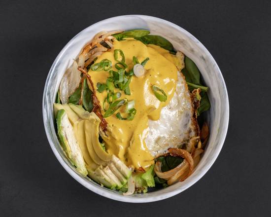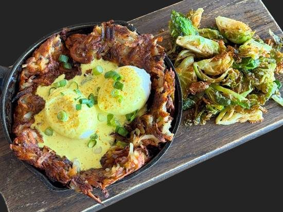 2 poached eggs or tofu, shredded hash potato and pumpkin, vegan hollandaise sauce. Comes with maple sriracha fried brussel sprouts.