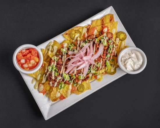 Corn chips, fajita beans, cashew sour cream, salsa, vegan cheese, avocado aioli, tomato, jalapeños, pickled onion.