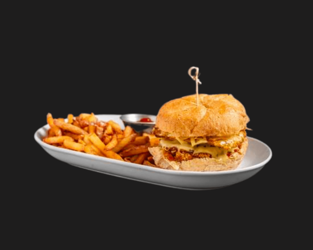 Kaiser bun, vegan margarine, wing patties, lettuce, tomato, onion, spicy bomb.