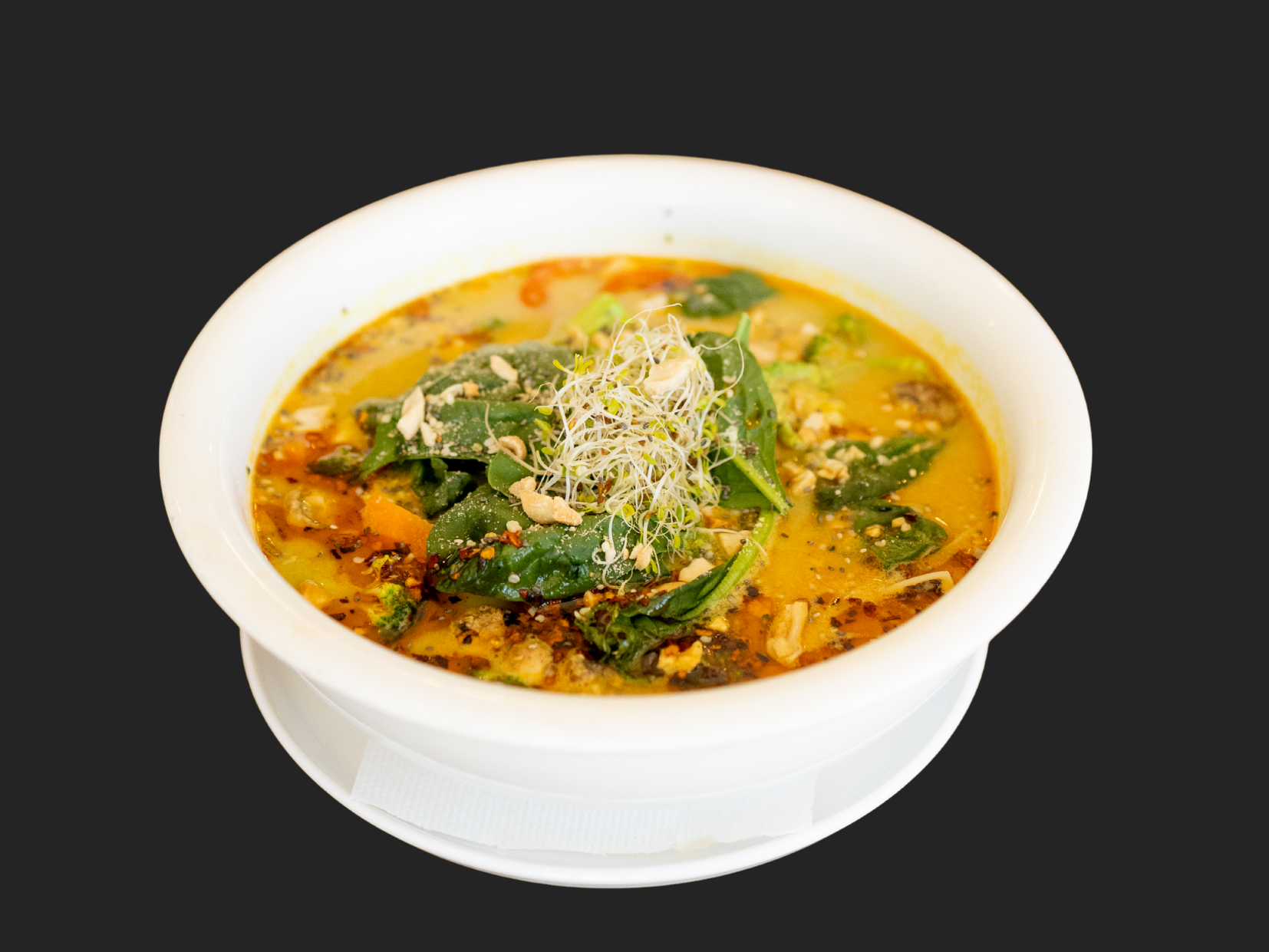 Coconut satay herbal broth with vermicelli, broccoli, peppers, carrot, mushroom, onion, zucchini and brussel sprouts. Garnished with spinach, alfalfa sprouts, peanuts, hemp hearts and chia seeds.